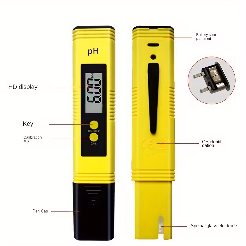 يحتوي على مستشعر (إلكترود) يغمس في السائل، ويُصدر الجهاز جهداً كهربائياً يتناسب مع تركيز أيونات الهيدروجين (H+)، ثم تحول وحدة القياس الرقمية الجهد إلى قيمة pH (من 0 إلى 14)، حيث 7 متعادل، أقل من 7 حمضي، وأعلى من 7 قلوي.