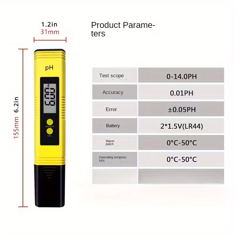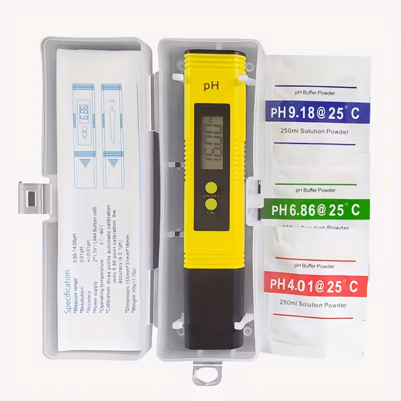 جهاز قياس الحموضة pH بمفتاحين ودقة 0.01 هو جهاز رقمي محمول بتصميم قلم يقيس مستوى الحموضة والقلوية لسائل ما بدقة عالية، ويحتوي على تعويض تلقائي لدرجة الحرارة (ATC) لضمان قراءات دقيقة بغض النظر عن حرارة السائل، وله مفتاحان للتحكم، وغالباً ما يُستخدم في الزراعة المائية، أحواض السمك، والمياه.